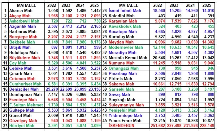 Hatay’ın ilçeleri arasında 2025 yılında bir önceki yıla göre İskenderun’un 3 bin 777 kişi azaldığı, Arsuz’un nüfusunun ise 5 bin 527 kişi arttığı görülüyor.